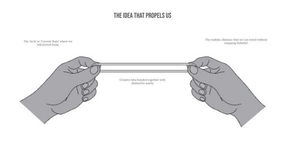 In the case of communication, this will typically be a creative idea that comes to life across various channels. When we think about the connective tissue within the stretch, we can think broadly about two areas. The idea itself and the distinctive brand assets which help wrap the idea and connect it back to the brand. Distinctive assets are bonding agents. They bond an idea to a brand.